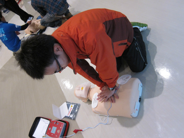 一次救命措置では、傷病者発見から救急隊員への引継ぎまで、心肺蘇生・AEDを使いながらシュミレーションをしました。