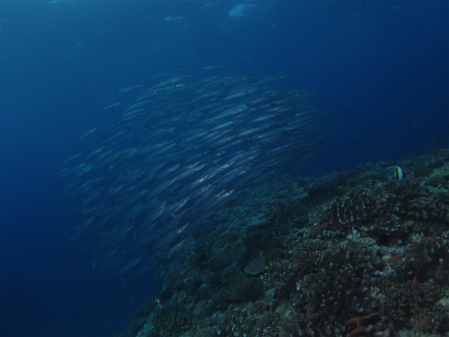 ちょうどよい下げ潮の中、おっきなハタやネムリブカ、でかい不発弾と思われるもの、最後はギンガメアジの群れで締め✌