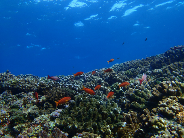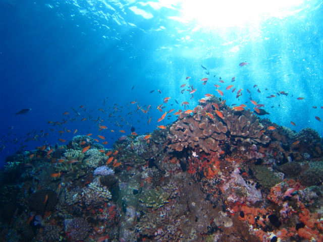 浅瀬には、サンゴ・キンギョハナダイなどが群れています。