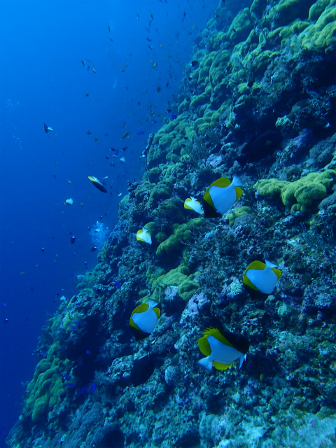 壁沿いには流れのある場所に群れる、カスミチョウチョウウオ。