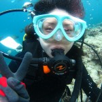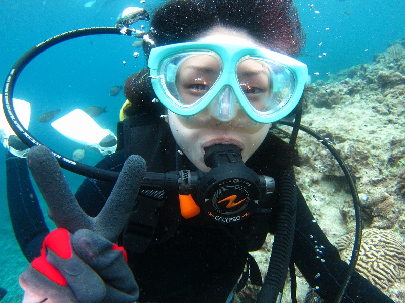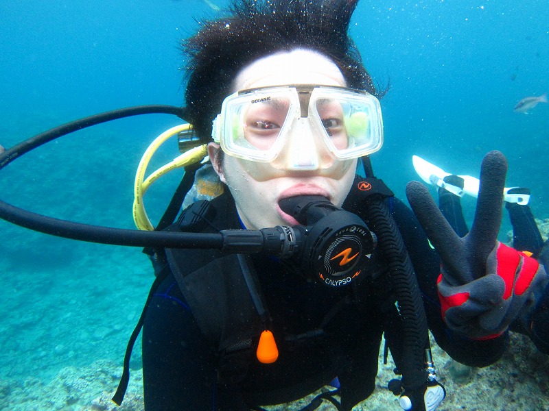 潜ってから深呼吸をしてリラックス。徐々に慣れてきました。カメラを構えると・・・はじめっからピース姿で