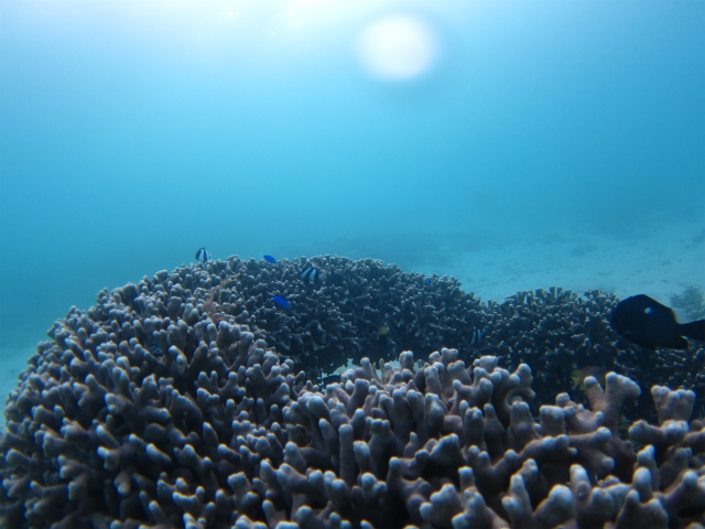 魚は、ハマフエフキやミスジリュウキュウスズメダイ、アイゴなどなど豊富が群れをなして泳いだりしています。サンゴもユビエダサンゴやオオトゲミドリイシ?と海草も群生していて、意外と綺麗なのです。