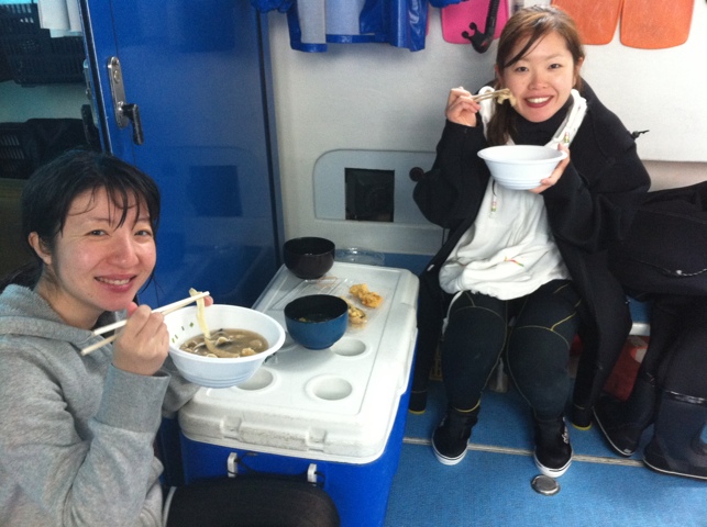 そして、今回は嘉手納近海ならではの・・・あたたかい沖縄そばが昼食に!!