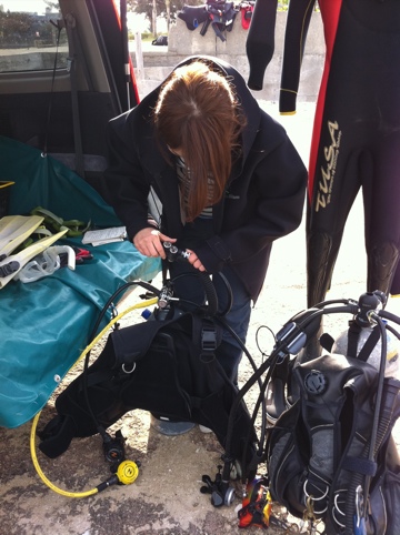 泳ぎだせば、さすがは体験ダイビングをたっぷりとやっていただけあってとっても上手。しかーし、BCDの使い方やセットの仕方を覚えるのは苦手なようで・・・水中での泳ぎと陸での行動に若干の差が生じていました♪