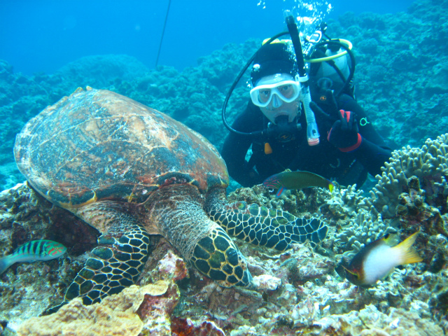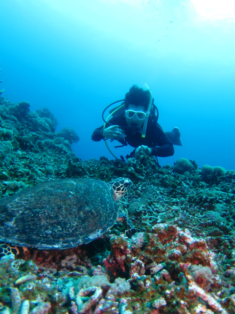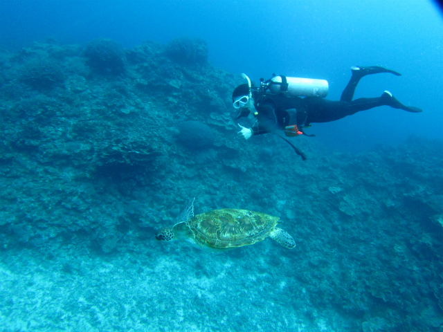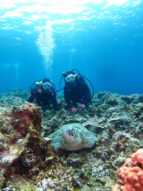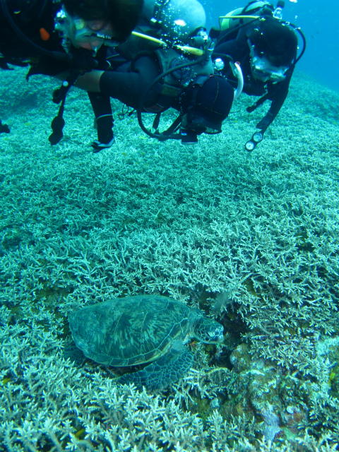 先日は、すべて目の前を泳ぎ去ってしまったウミガメ君たちでしたが、本日はゆっくり一緒に泳ぐことができました♪