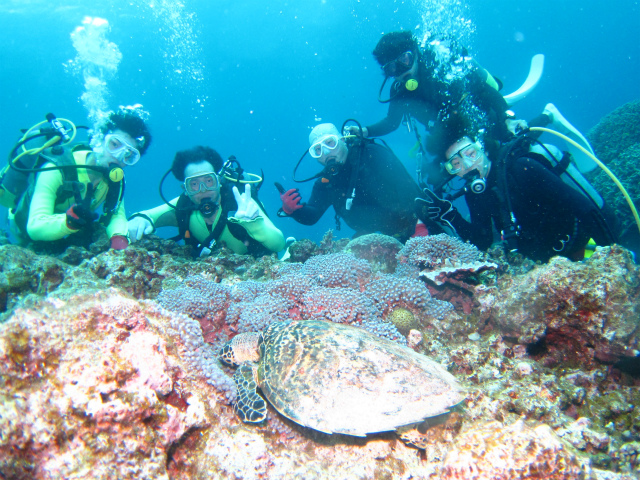 初めてで緊張し、耳抜きに苦戦してしまったチームもありましたが、船の回りをアオウミガメが優雅に泳いでくれていたので、なんとか見る事はできましたね~