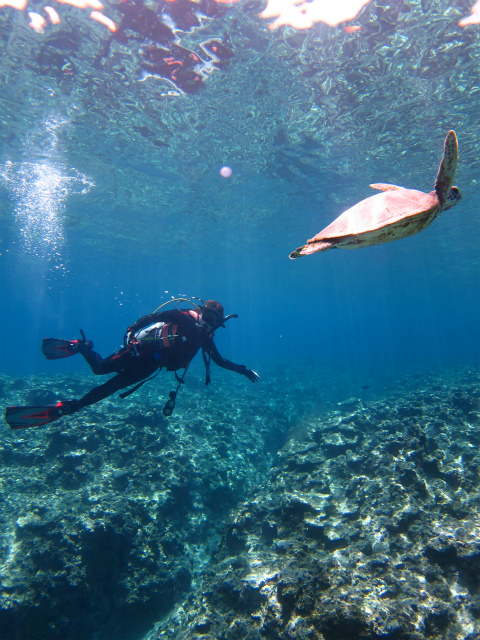 体験のお客様も慣れない慣れない~なんてはじめは言っていましたが、ウミガメにも会えて、3ダイブもできて、とっても上手になっていました。