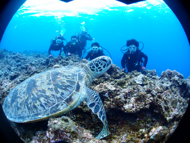 はじめは、嫌~な空気が流れていましたが、このポイントの長ともいえるアオウミガメと遭遇♪