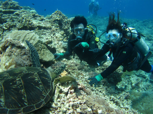 確率は少ないけれど、一応カメもいるんですよ~なんて話していたら、2チームともアオウミガメに遭遇!!
