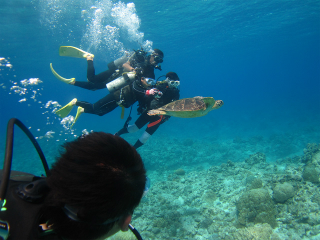 ここでも2チームとも見る事ができ、2本目とは違い人慣れをしているカメだったので、一緒にゆっくりと泳ぐ事が出来ましたね♪