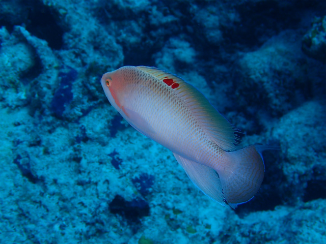 この写真は雄で、背びれに赤い斑点がある事が特徴です。