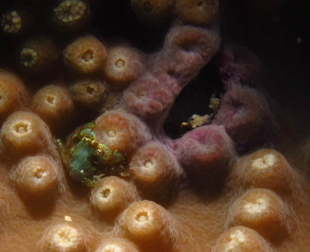 スリバチサンゴの仲間にある穴をよ~く見るとなにか詰まっています。。。