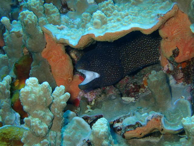 ウツボは外敵が近づくと、口を大きく開けて威嚇してくるので、違いが見やすいですね。