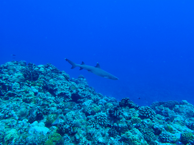 キホシスズメダイや、キンギョハナダイ、グルクンの大群も見れたと思いきや、ここでも大きなネムリブカ!!