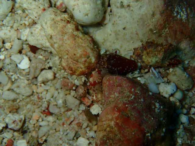 ハサミで、小さなカニハサミイソギンチャクを掴んでいる、小型のカニ。