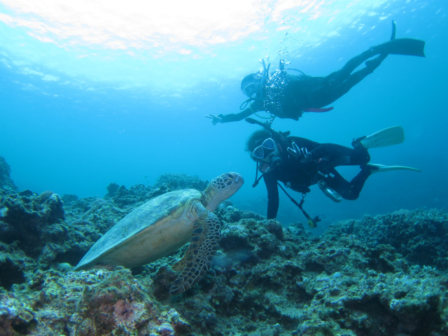 魚もサンゴも沢山のポイントで、サメはいなかったものの、タイマイ・アオウミガメには出会えたようです。