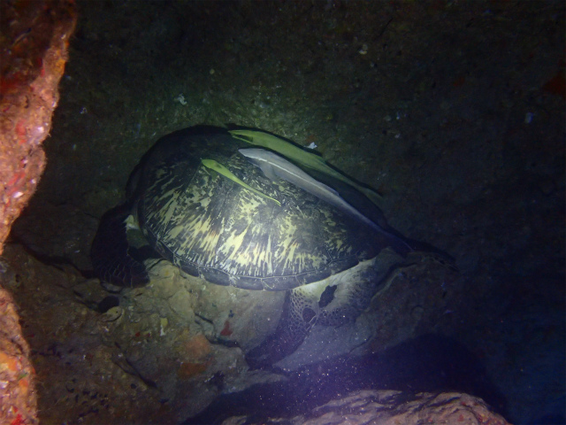 コバンザメ従えた、大きな大きなアオウミガメ。