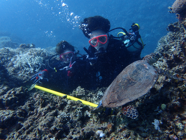 ちょっとうねりが入り、透明度も良いとは言えない中の、ウミガメポイント選択。。。