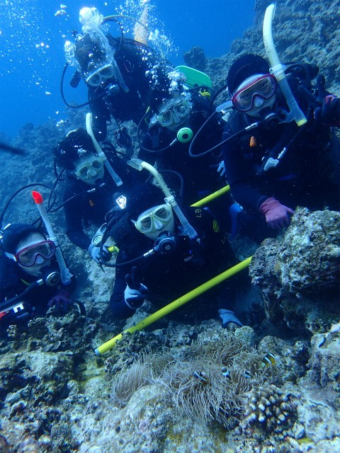 珊瑚の養殖を行っているGala青い海の「さんご畑」で興味津々に話を聞いてくれました。