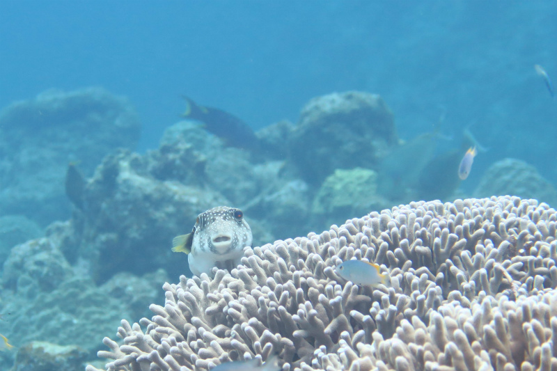 最後は気持ちよさそうにサンゴをアゴ置きにしてるサザナミフグで締め(笑)