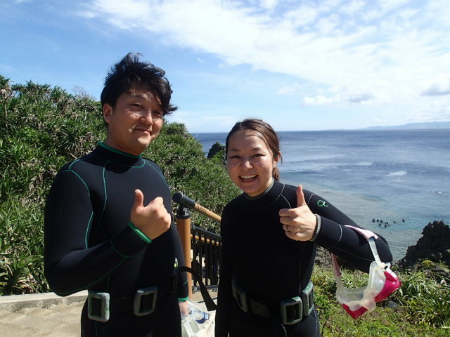 今日もとっても良いお天気と、海況でした♪今日は真栄田岬にて、ご夫婦と共に体験ダイビング。