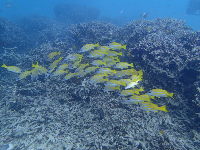 ユビエダハマサンゴに群れる魚たちは、まるで竜宮城のようでした!