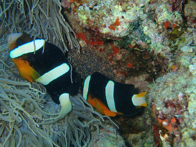 春といえば、水中では産卵・子育ての時期ですが、クマノミもせっせと卵の世話をしていましたよ~。