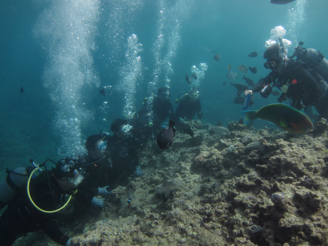 皆さんあっという間に水中に潜る事ができましたね。余裕があったので、クマノミ観察やロクセンスズメダイの産卵場所を見学したり、ダイビングの醍醐味の生物ウォッチを堪能して頂きました♪