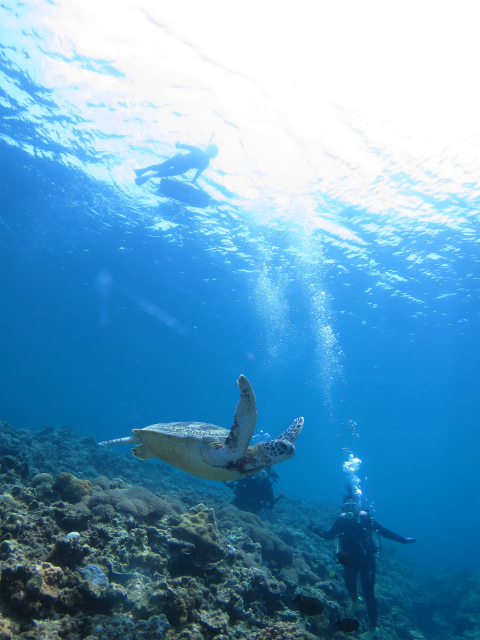 お2人ともダイバーさんチームもいらっしゃいました!!ということで、水慣れもスムーズに進み、FUNチーム、スノーケルチームも合わせて、全員がウミガメとご対面♪