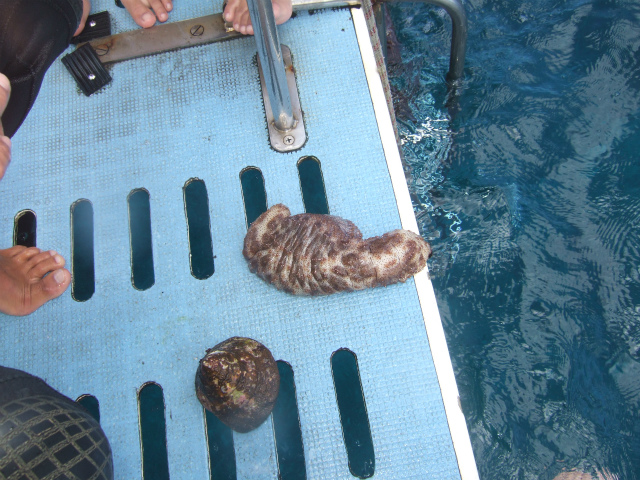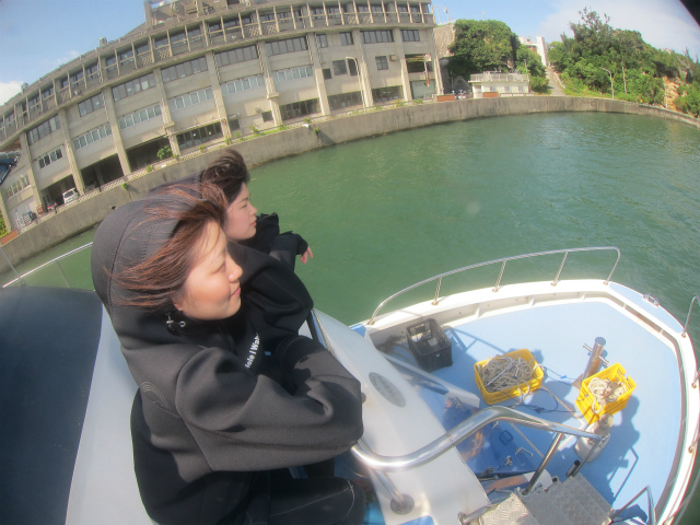 お昼休憩には、嘉手納中学校の社会科実習の生徒の生き物観察に便乗♪ラストは、2名が3ダイブ目へ!!