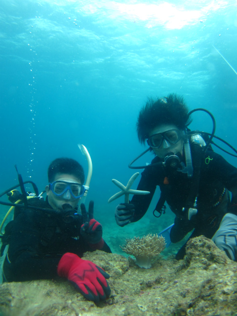 体験ダイビングのお母さんと息子さん、シュノーケリングのお父さんもこの時期ならではの真栄田を見る事ができましたね♪体験ダイビングではふわふわと無重力の状態を楽しみ、シュノーケリングでは青の洞窟も覗きに。