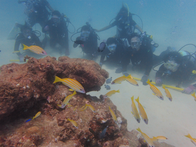 お父さんお母さんは、初ダイビングから少し緊張気味でしたが、水中に入ってみるととっても上手!!色んな魚たちの行動に興味を持ったり、レンタルカメラでたくさん写真を撮ったり。