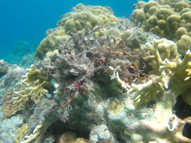 こんな感じでサンゴに絡んでいる釣り糸を、サンゴを折らないように取っていきます。