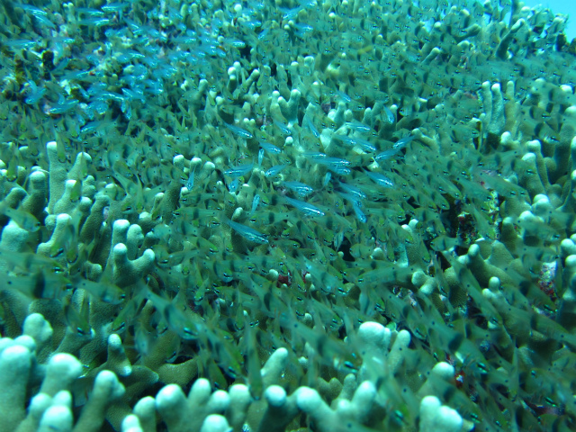 サンゴの間に無数のクロオビアトヒキテンジクダイと、スカシテンジクダイが。